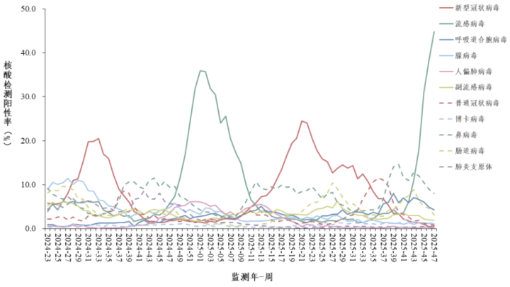 哨点医院门急诊流感样病例呼吸道样本病原体核酸检测阳性率每周变化趋势。图源《全国急性呼吸道传染病哨点监测情况(2025年第47周)》